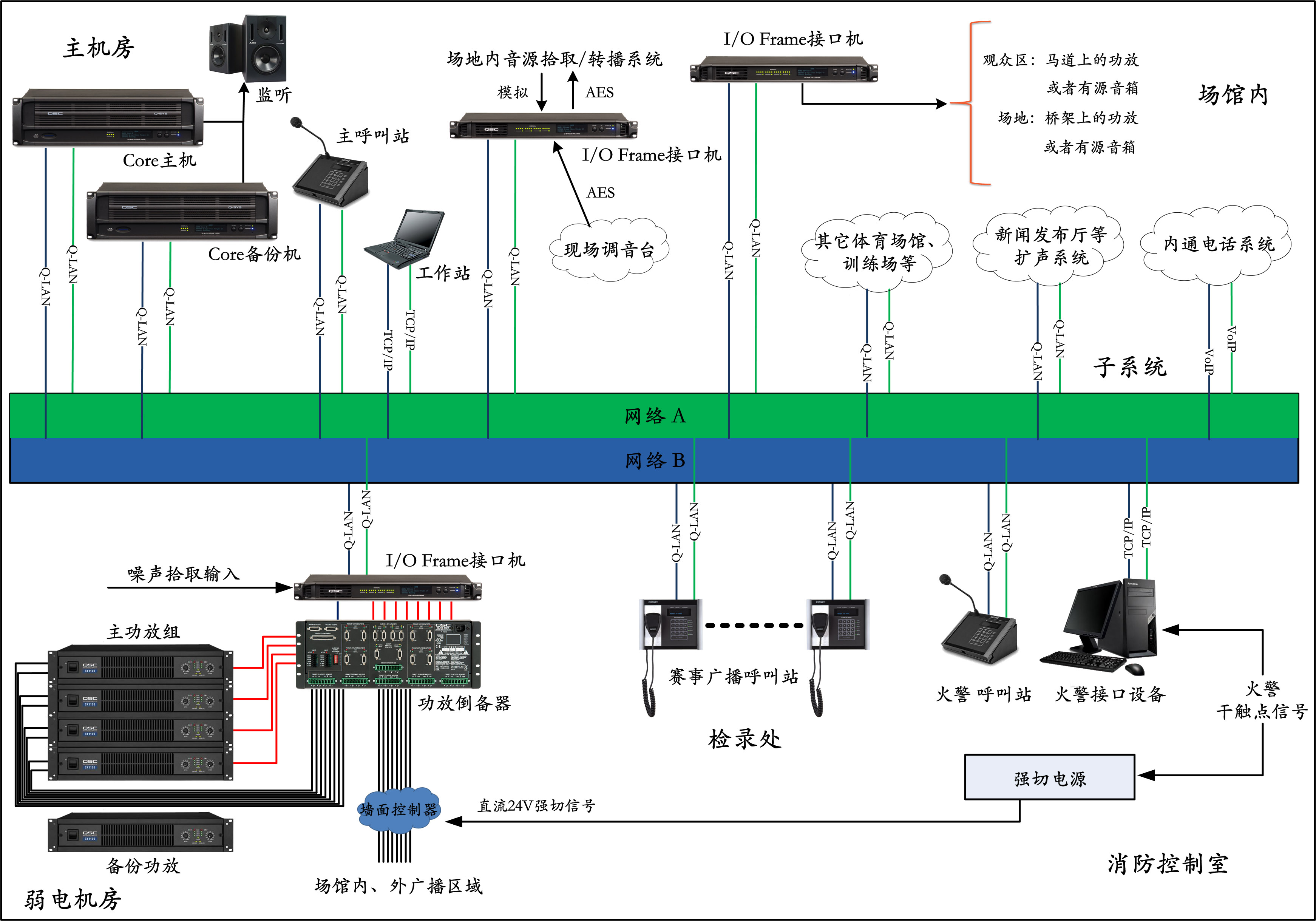 1. 將場地擴聲、賽事廣播與消防廣播結合到一起,利用一套系統實現所有功能,最大化優化資源配置;