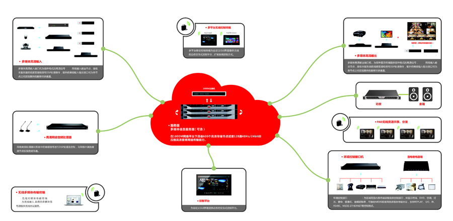 該項目為實現實時多媒體教學和會議功能,總控設備實現控制人員對整個系統的音頻信號流、視頻信號流、控制信號流等信號的總控和分配。