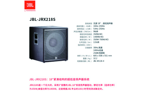 JRX218S是一個巨大的、采用3"音圈的JBL 18"低音揚聲器驅動,額定功率(連續功率)為350W,峰值功率為1400W,這是根據JBL專業的100小時苛刻測試確定的。